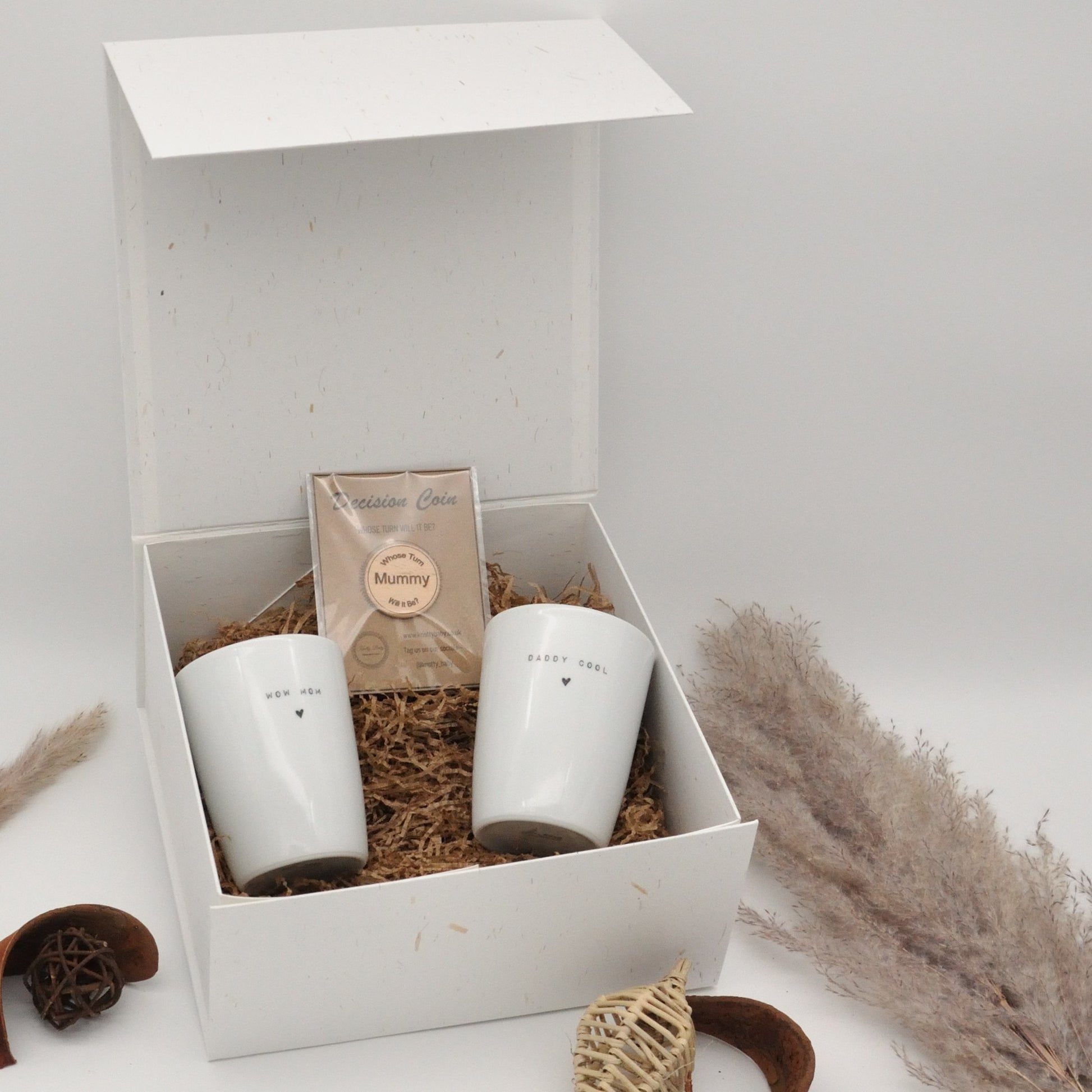 Das Leben als frischgebackene Eltern kann stressig sein. Ein Kaffee- oder Teemoment kann für die nötige Ruhe sorgen. Deshalb enthält dieses Geschenkpaket zwei Tassen mit der Aufschrift „Wow Mom“ und „Daddy Cool“. Wir fügen außerdem eine Entscheidungsmünze hinzu, um die restliche Pause gerecht auf Mama oder Papa aufzuteilen.