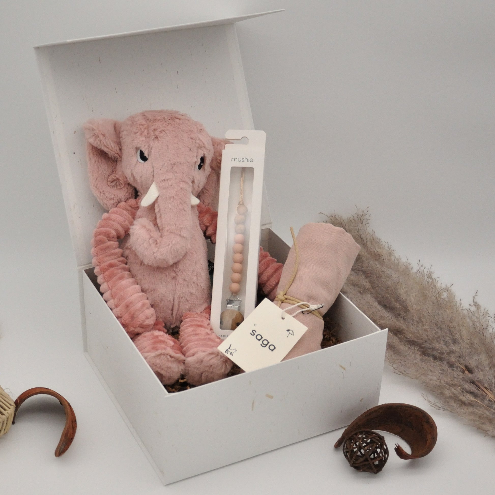 The gift box has a white finish with straw accents and a beige satin bow and contains products beautifully wrapped in white floral tissue paper. The box, which measures 23cm x 23cm x 11cm and has a magnetic closure, can be reused to preserve baby memories.