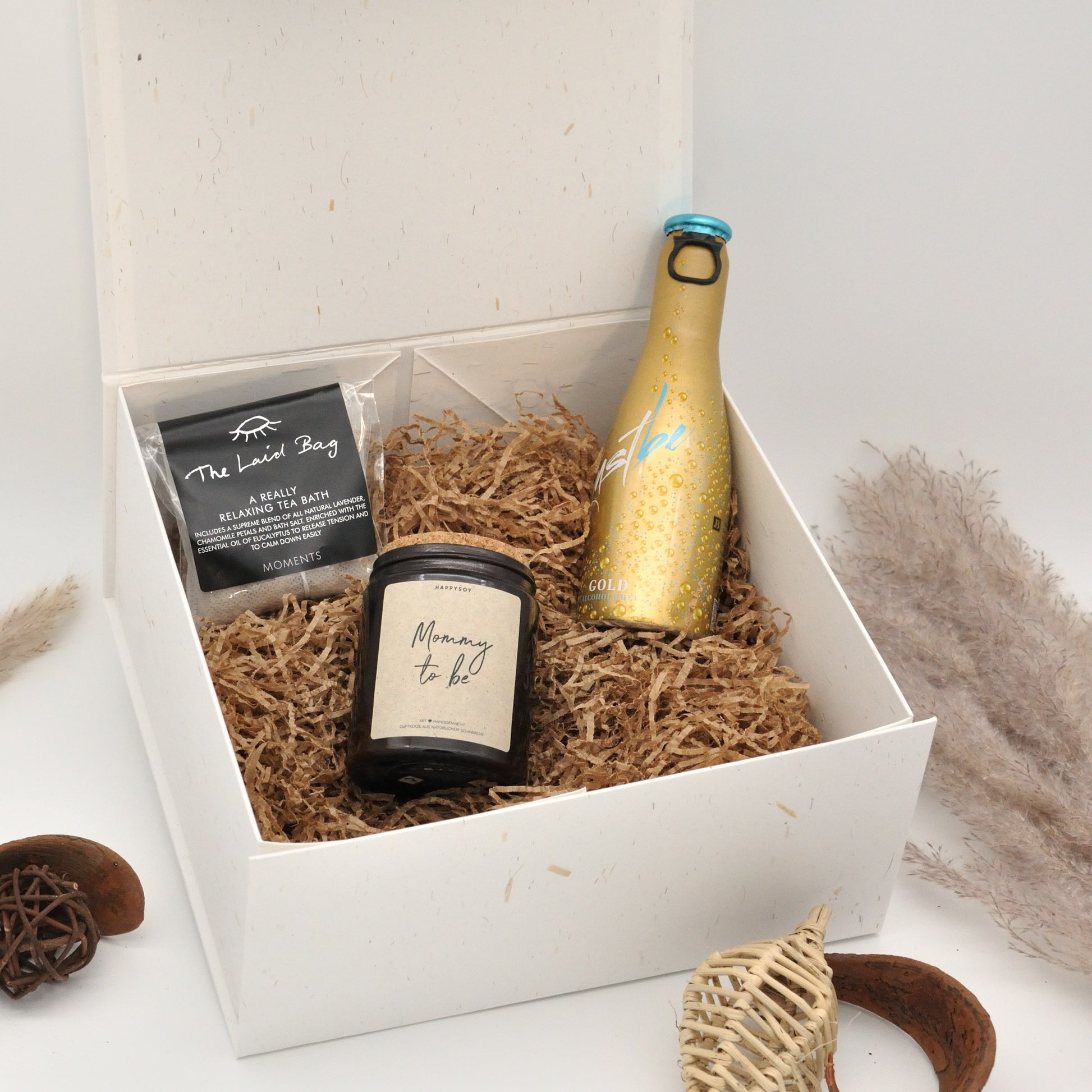 • Scented candle with the inscription 'mommy to be':The soft, soothing scent helps to relax and find a moment of peace during the exciting period of pregnancy. A loving reminder of the special journey ahead.