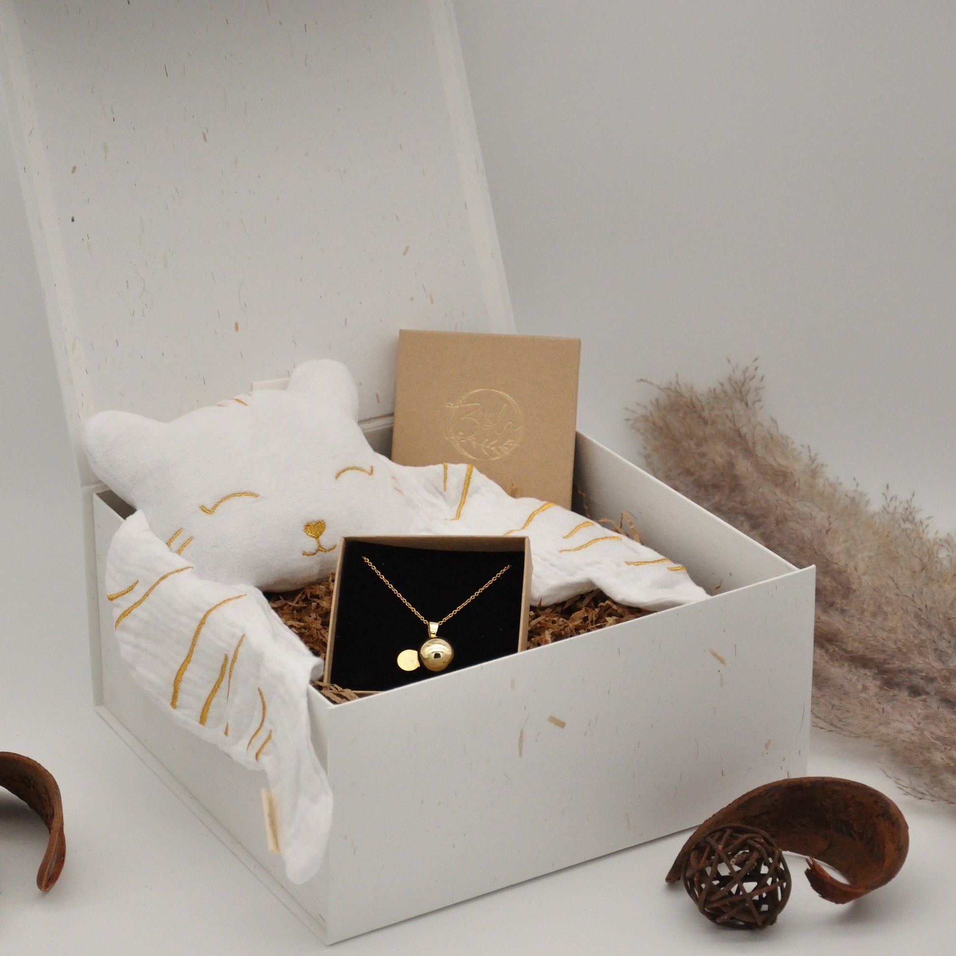 Tous nos coffrets cadeaux sont offerts et expédiés dans une boîte cadeau luxueuse , qui peut être offerte directement à la (future) maman. De plus, vous pouvez ajouter une carte avec votre propre texte qui sera écrit à la main par l'équipe Wowwy.