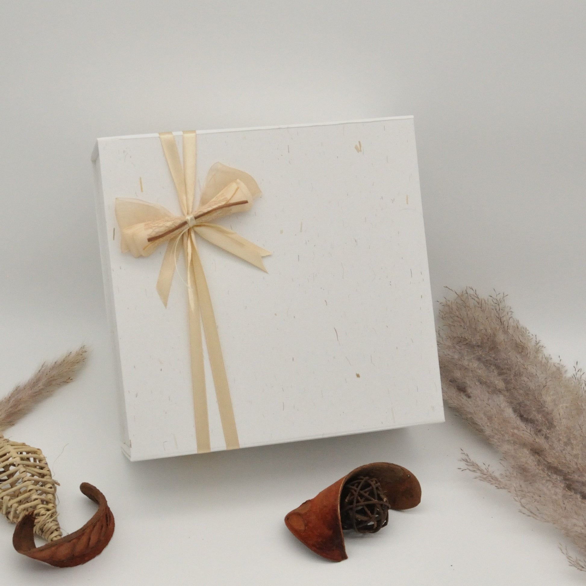 Le coffret cadeau a une finition blanche avec des accents de paille et un nœud en satin beige et contient des produits joliment emballés dans du papier de soie blanc avec un motif floral. La boîte, qui mesure 23 cm x 23 cm x 11 cm et possède une fermeture magnétique, peut être réutilisée pour préserver les souvenirs de bébé.